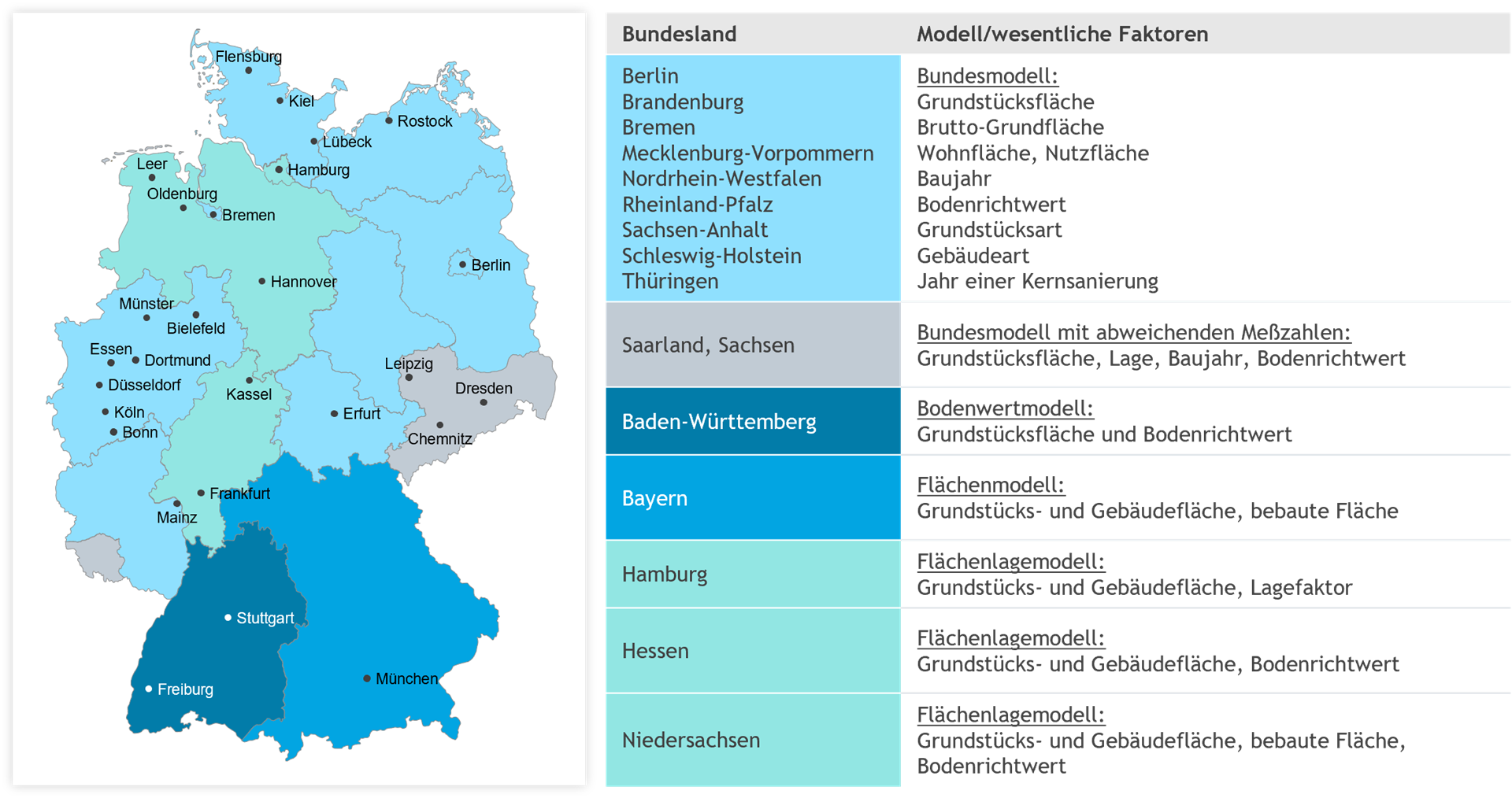 Dazu sind die dafür notwendigen Daten aus unterschiedlichen Quellen und Formaten (digital / Papier) zusammenzusuchen und -zufassen. Hinzukommt, dass es neben dem sog. Bundesmodell in den Ländern Baden-Württemberg, Bayern, Hamburg, Hessen, Niedersachsen, Saarland und Sachsen eigene Länderregelungen gibt. Je nach Lage der Grundstücke müssen also unterschiedliche Daten ermittelt, gesucht und erklärt werden.