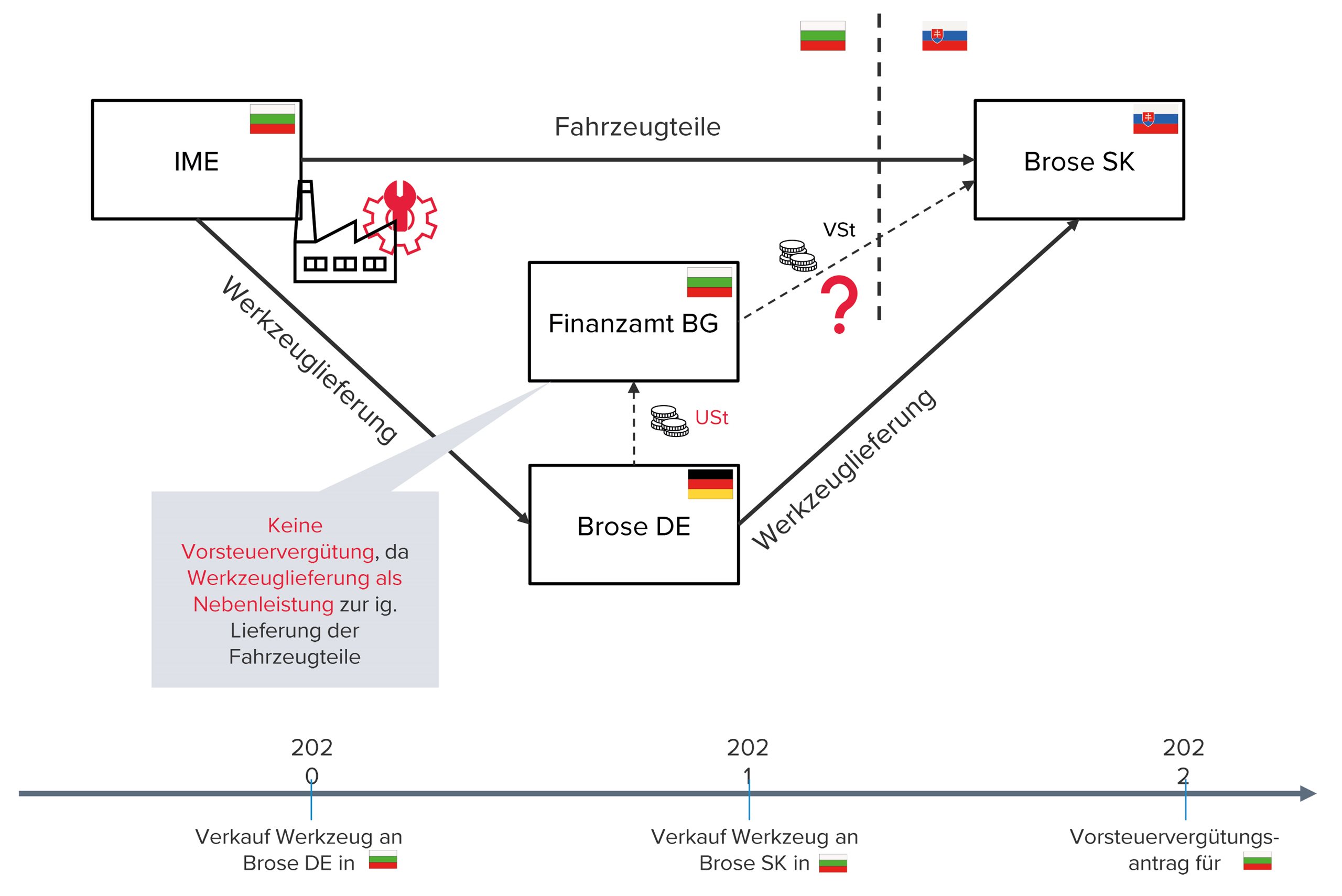 Während des Produktionszyklus der Fahrzeugteile verkauft Brose DE das Werkzeug an Brose SK, wobei dieses wiederum in Bulgarien bei IME für die Produktion der Fahrzeugteile verbleibt. Brose DE stellt Brose SK eine Rechnung über den Verkauf des Werkzeuges unter Ausweis von bulgarischer Umsatzsteuer aus. Brose DE führt die Umsatzsteuer ab und Brose SK macht diese im Rahmen eines Vorsteuervergütungsantrages geltend.