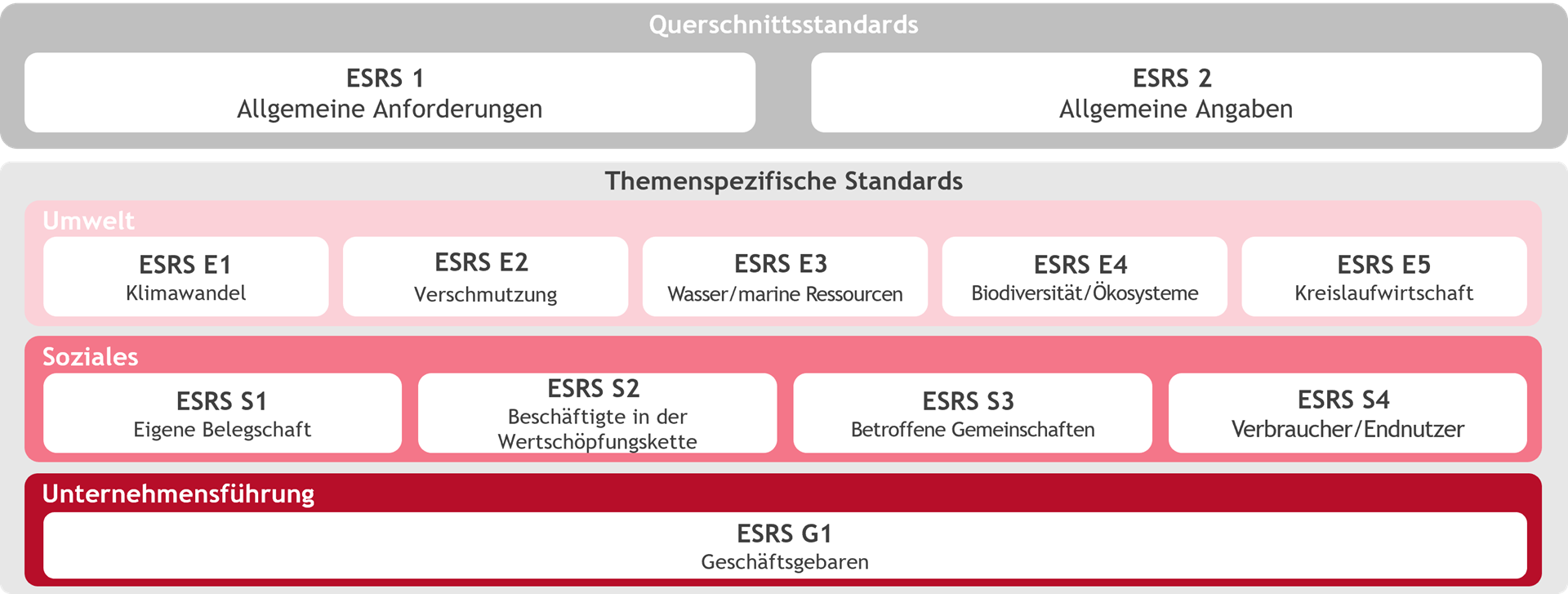 Die ESRS-Architektur baut auf konzeptionellen Richtlinien und Prinzipien auf, die sich im ESRS 1 finden. EFRAG definiert sektorübergreifende, sektor- und unternehmensspezifische Standards. In den Bereichen Umwelt (E), Soziales (S) und Unternehmensführung (G) sind einzelne Standards untergeordnet, die zu berichtende Inhalte mit Indikatoren und Kennzahlen vorgeben.