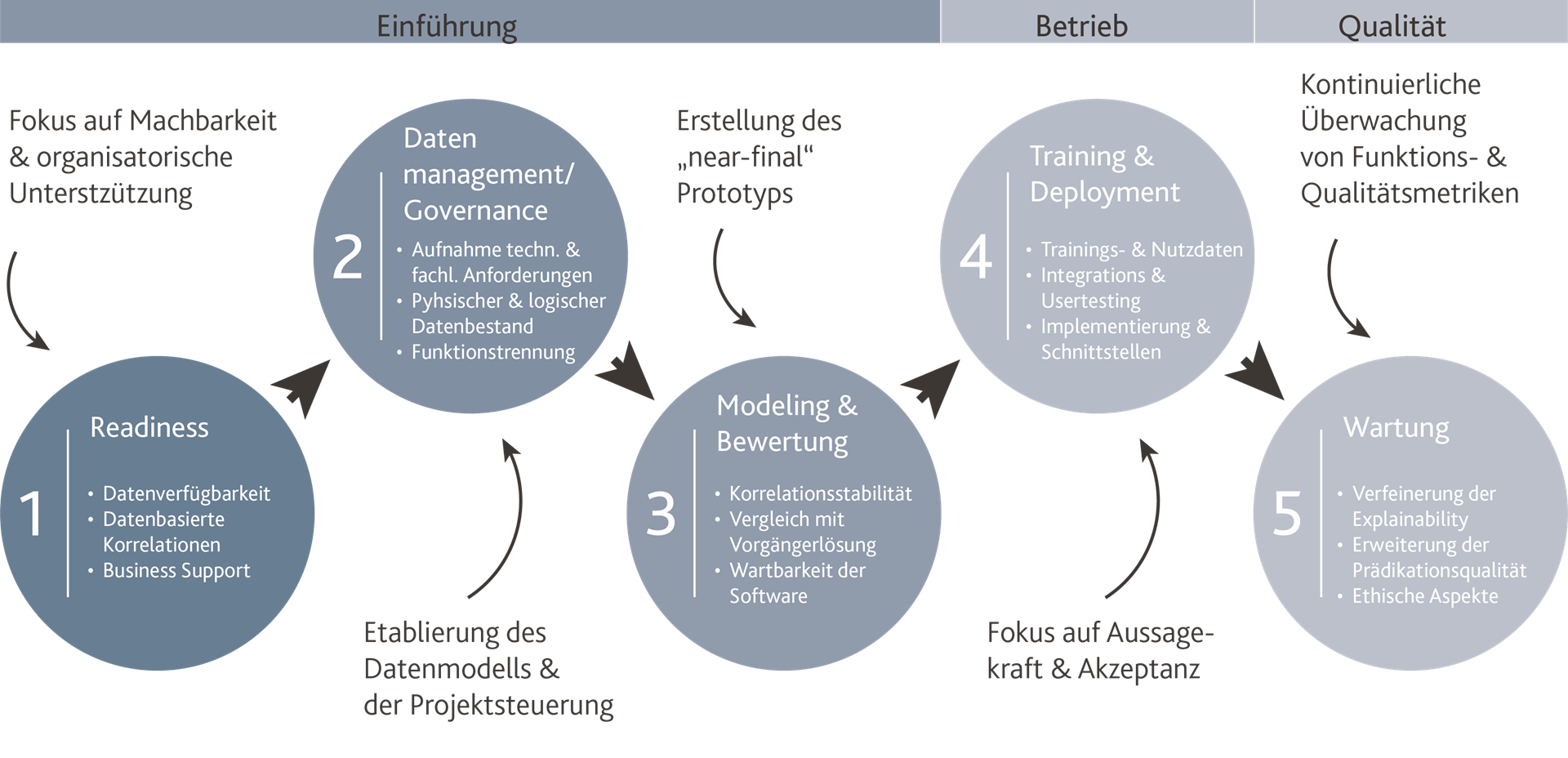Unser Vorgehensmodell berücksichtigt sowohl die Anforderungen des PS 861 als auch gängige Branchenstandards wie bspw. ein modifiziertes CRISP-DM und das KI-Stufensystem des Frauenhofer Instituts. Wir begleiten Sie damit durch alle Phasen Ihres KI-Projektes: