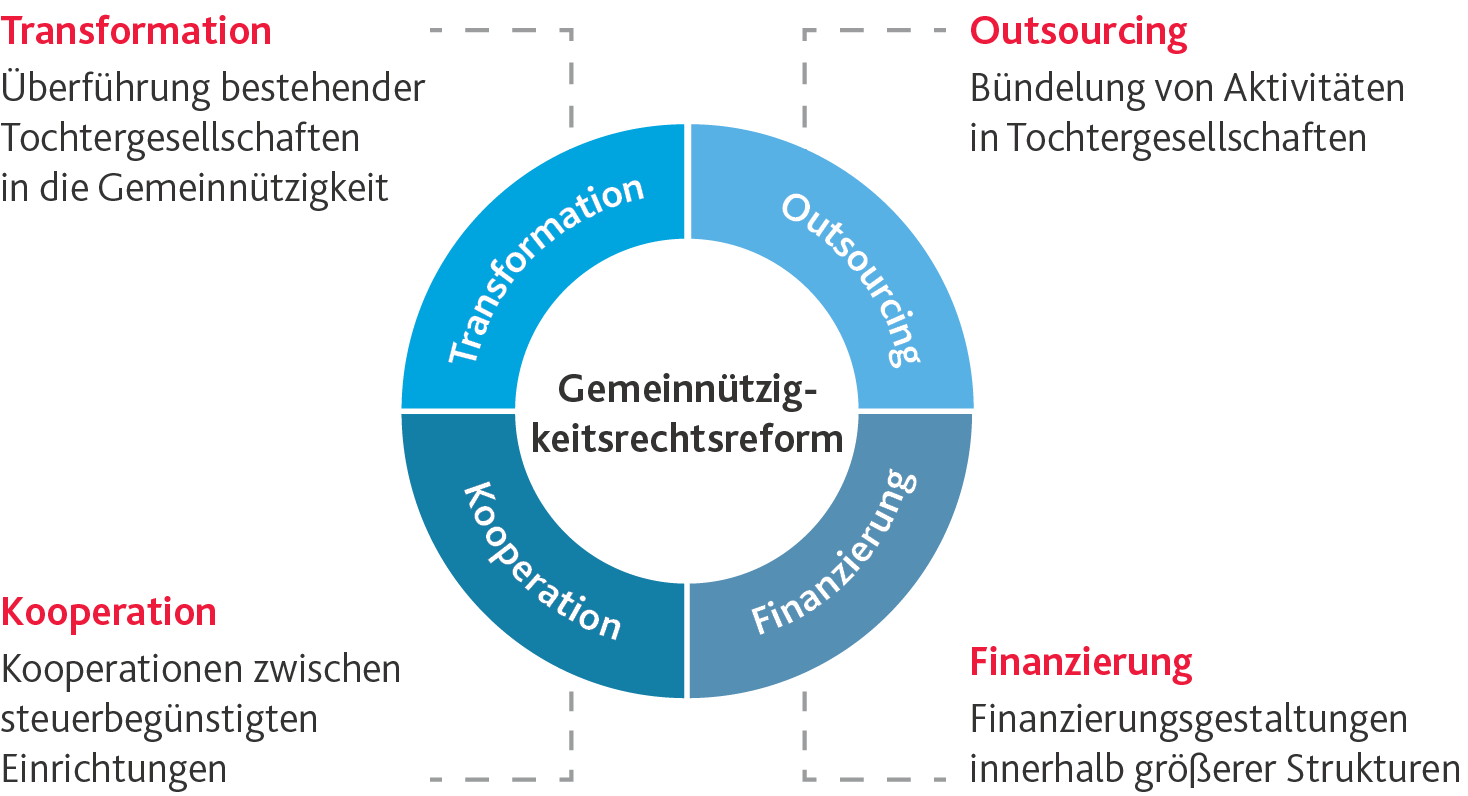 Die rechtlichen Rahmenbedingungen für steuerbegünstigte Einrichtungen in Deutschland sind restriktiv und stellen diese immer wieder vor große Herausforderungen insbesondere auch im Hinblick auf optimale Strukturen und Prozesse. Wirtschaftlich Wünschenswertes und rechtlich Mögliches klaffen häufig auseinander. Die aktuelle Gemeinnützigkeitsrechtsreform bringt tiefgreifende Erleichterungen, insbesondere in der Zusammenarbeit von steuerbegünstigten Einrichtungen.