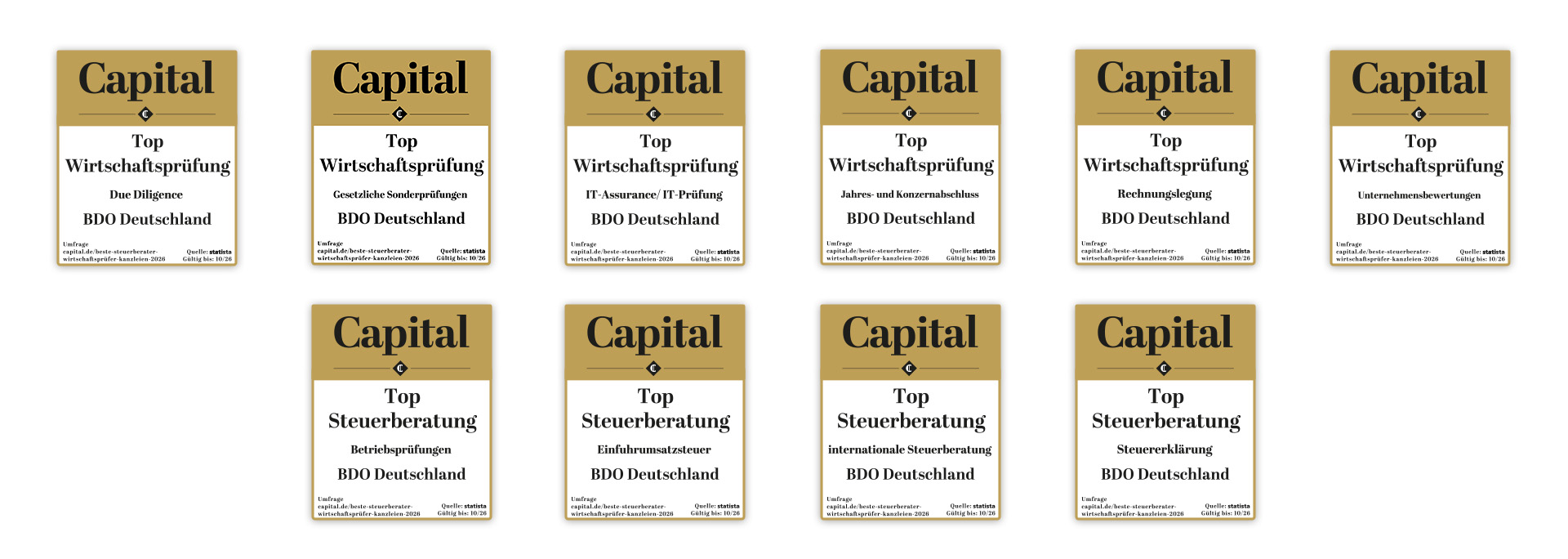 Das Wirtschaftsmagazin Capital hat 2025 gemeinsam mit dem Marktforschungsinstitut Statista zum ersten Mal die besten Steuerberatungs- und Wirtschaftsprüfungsgesellschaften in Deutschland ermittelt. Die BDO AG Wirtschaftsprüfungsgesellschaft wurde in 11 Fachbereichen ausgezeichnet
