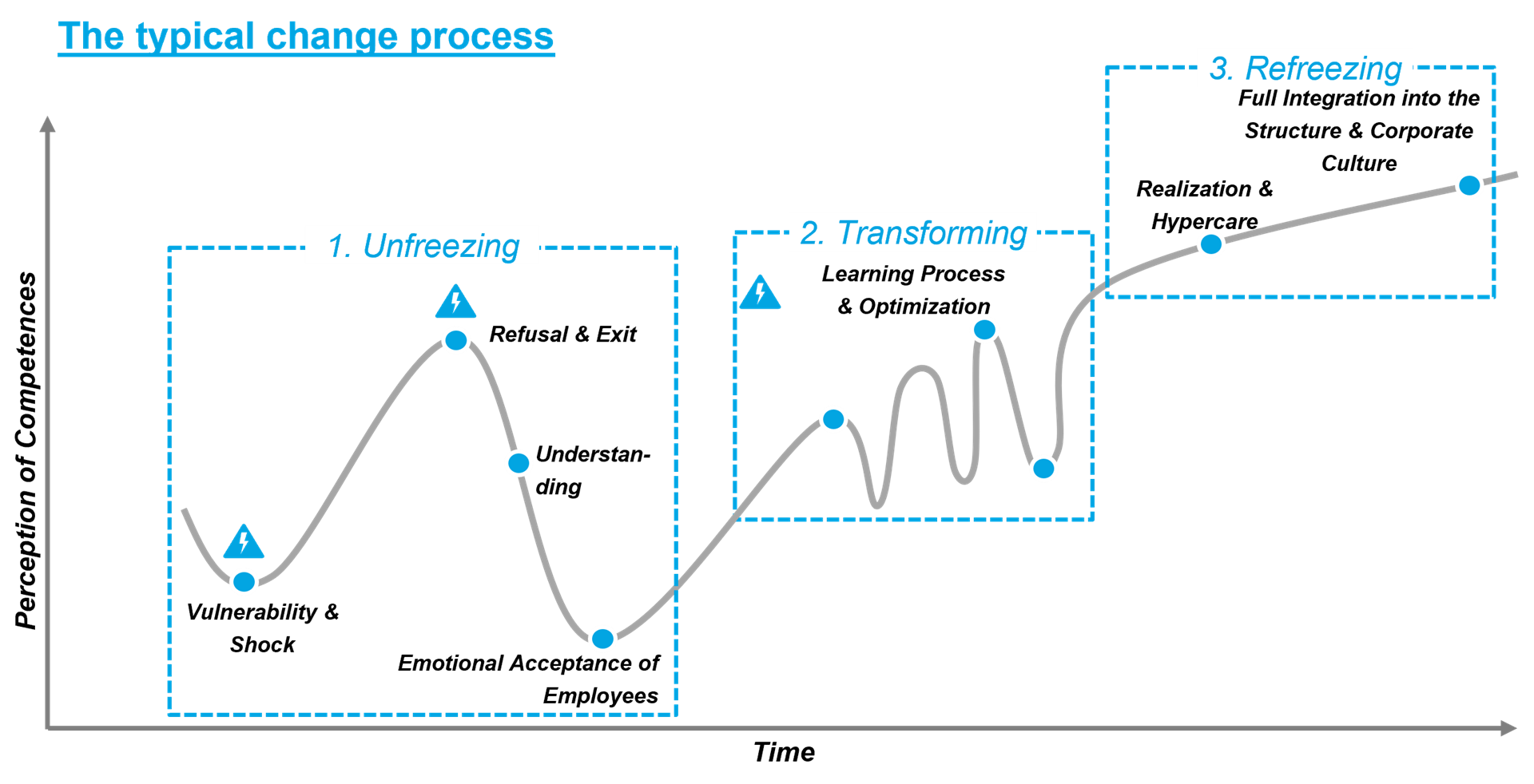 Transformation & change means profoundly changing existing structures and processes. The first challenge is to ensure the so-called change readiness of the organization and the relevant stakeholders. Change measures often meet with resistance from managers and employees. Therefore, BDO's change management consulting approach focuses equally on employee communication, active stakeholder management and acting in line with the corporate vision. Continuous communication with the relevant stakeholders is essential to significantly reduce resistance among the workforce and to create the highest possible level of commitment in the context of the transformation project. To ensure that all relevant stakeholders pull together and work together in a goal-oriented manner, it is particularly important to win over the relevant executives as change agents for the change process to exemplify the change with a stringent "tone from the top". The change management consulting team actively supports you in these extensive challenges to ensure that your transformation project is a success.